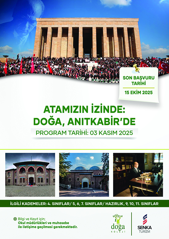 Atasının izinde gururla yürüyen ve Cumhuriyetin değerlerini geleceğe taşıyan Doğa Nesli, Ulu Önder Mustafa Kemal Atatürk’ün ebedi istirahatgahı Anıtkabir’i ziyaret ediyor. 3 Kasım'da gerçekleşecek olan ziyarete katılım ve başvuru için kampüs müdürlükleri ve muhasebe birimleriyle iletişime geçebilirsiniz.